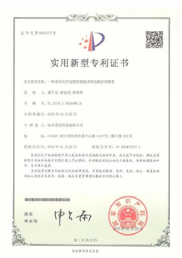 電機(jī)電控裝置專利證書(shū)