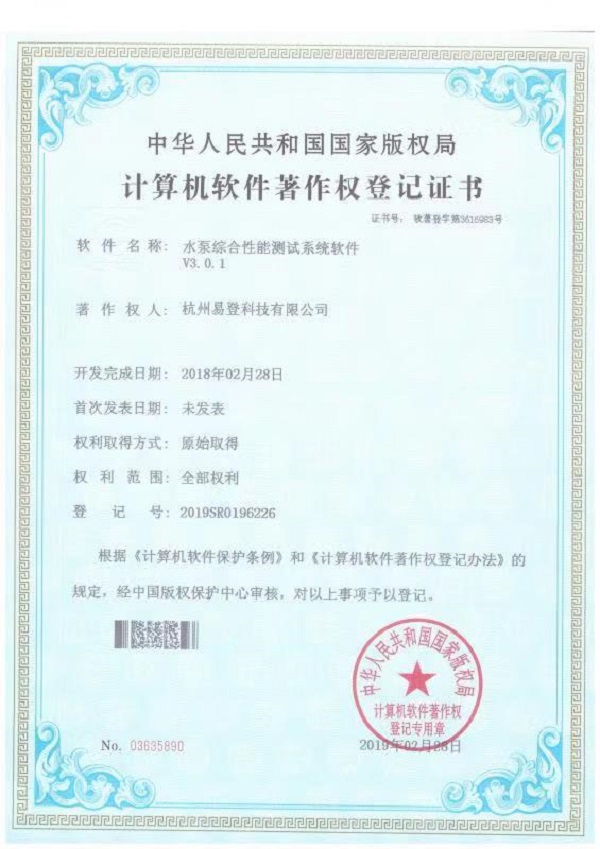 水泵綜合性能測(cè)試軟件證書(shū)